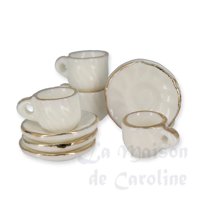 4 tasses, sous-tasses, pocelaine blanche filet doré miniatures 1/12ème