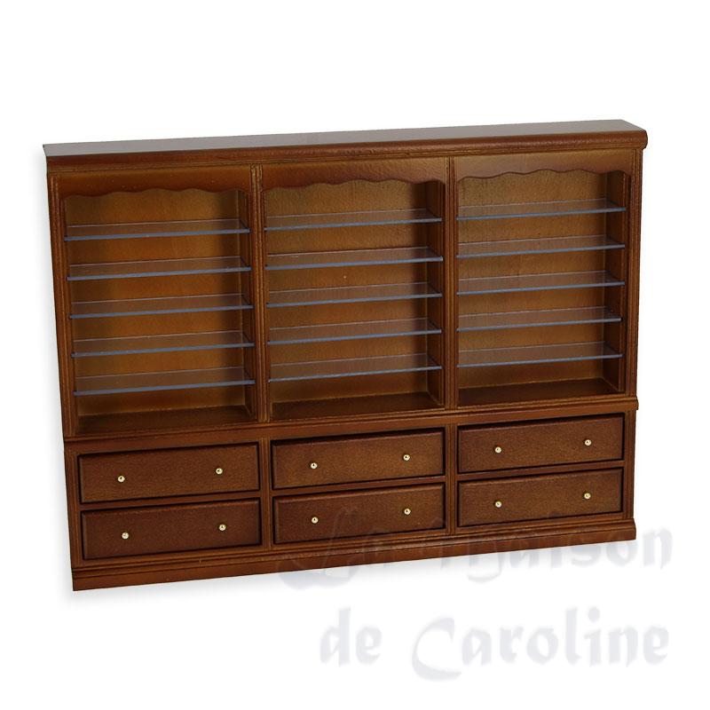 Bibliotheque tiroirs triple noyer miniatures 1/12ème