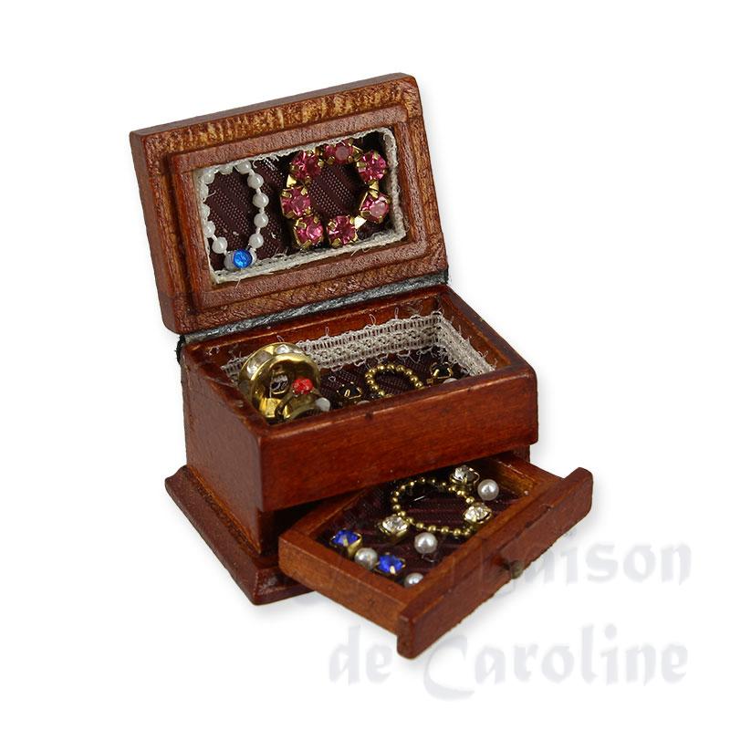 Boîte à bijoux bois garnie, tiroir miniatures 1/12ème