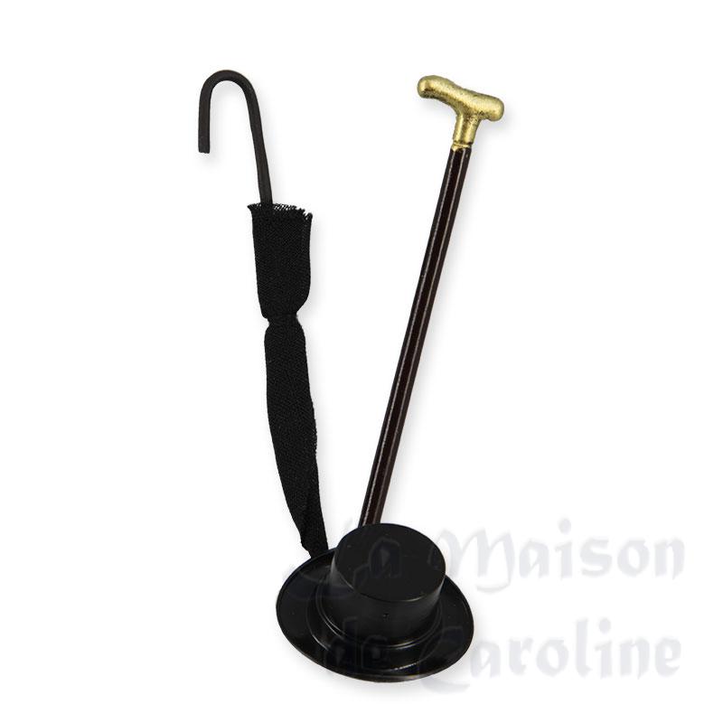 Set canne, parapluie et chapeau miniatures 1/12ème